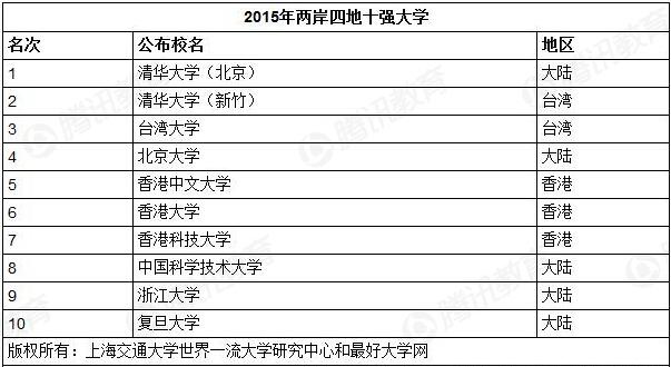 騰訊教育訊 上海交通大學世界一流大學研究中心和最好大學網今日正式發布了2015年“中國兩岸四地大學排名”,這是該排名自2011年問世以來第五次發布。