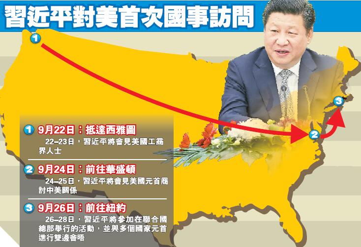 26日至28日,習近平的美國之旅將從「國事訪問時間」轉為「聯合國時間」。他將出席聯大一般性辯論和聯合國發展峰會、主持全球婦女峰會和南南合作圓桌會、出席氣候變化問題領導人工作午餐會等聯合國成立70周年系列活動,并闡述中國對國際秩序和格局、全球發展和治理等重大問題的主張,宣布中方在維護世界和平、促進共同發展等方面的重大舉措。