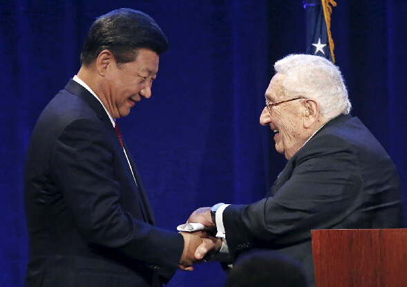 习近平(左)在演讲前与美国前国务卿基辛格握手。