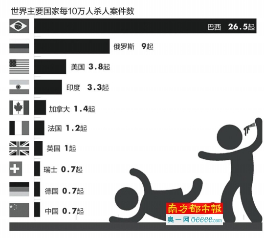 數據顯示,去年世界主要國家每10萬人殺人案件數中,中國、德國、瑞士均為0 .7起,英國1起、法國1.2起、加拿大1.4起,印度3.3起,美國3.8起,俄羅斯9.0起,而巴西則有26.5起。