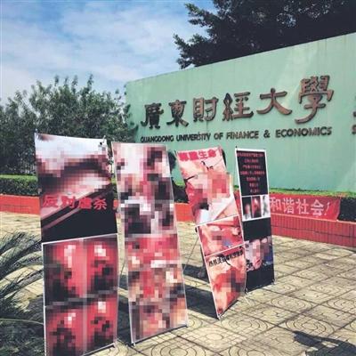 昨日中午,多名動物保護志愿者前往該校門前拉起橫幅、懸掛虐貓照片表示抗議,并通過微博公布了涉事學生的虐貓視頻。此后,廣東財經大學學生通過微信公眾平臺發布消息,稱動物保護志愿者行為過當,“人肉學生照片,將虐貓視頻二次傳播不妥”。