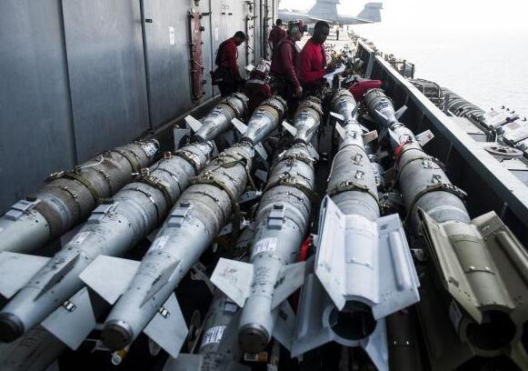 資料圖:航母上的美軍空勤人員為執行轟炸IS任務的戰機準備彈藥