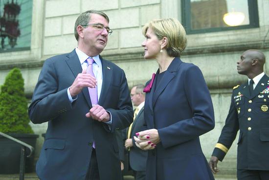 當地時間13日,美國防長卡特(左)在波士頓舉行的美澳“2+2”會談上與澳大利亞外交部長畢曉普交談。