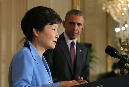 在美国白宫,朴槿惠在和奥巴马共同会见记者时进行发言。(韩联社)