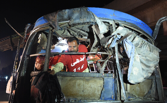 19日,一名男子在巴基斯坦奎达发生爆炸的客运汽车上搜查。新华社/法新
