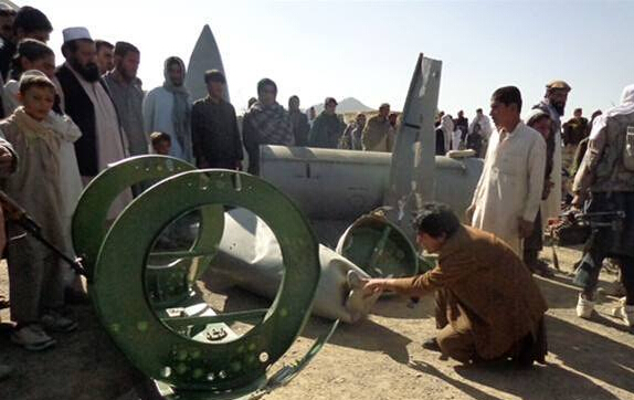 阿富汗塔利班武装分子与坠落的美军F16战斗机部件“合影”。(图片来源:新华/法新)