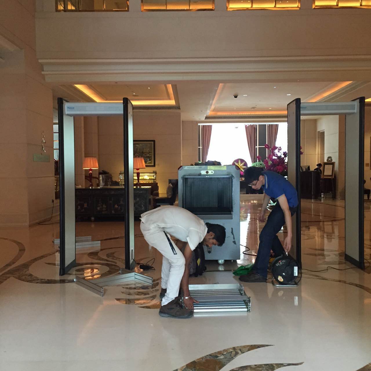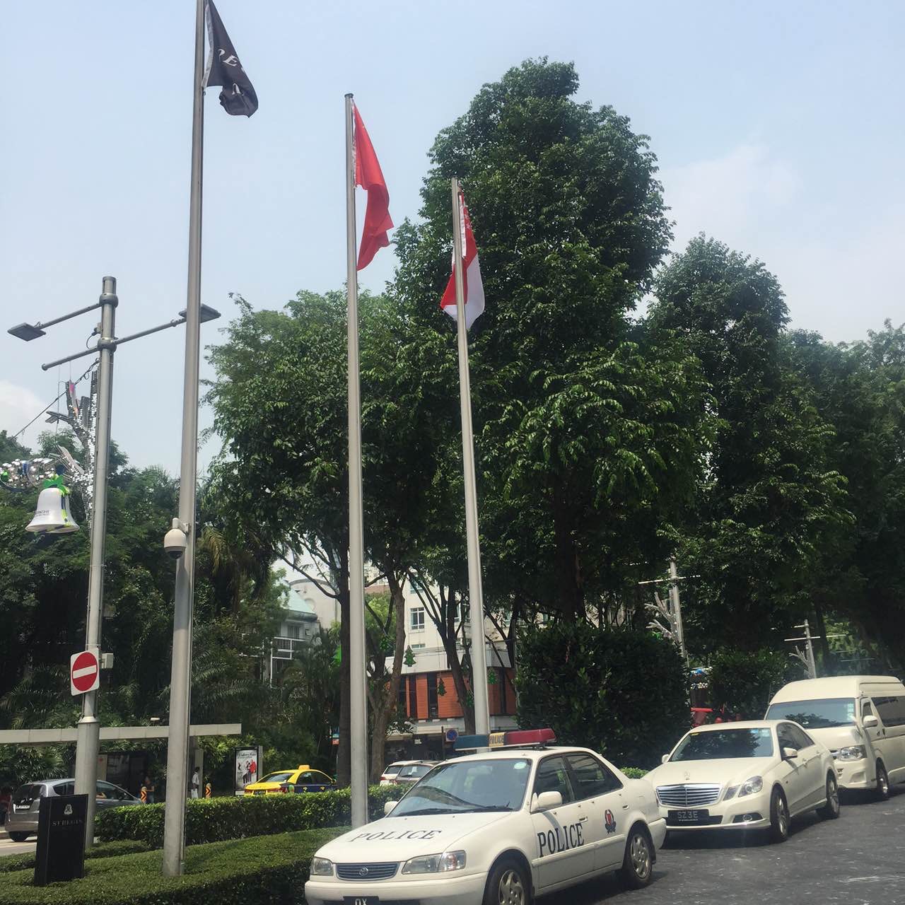 【香港商报网讯】記者木子新加坡報道:中國國家主席習近平下榻的酒店已基本清埸,門口停著警車,升起中新兩國旗,只有工作人員進進出出,不知手中拿的是否是習大大禮服。安檢門還在搭建安中,估計一只烏蠅也飛不進去了。