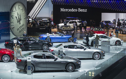 這是11月19日在美國洛杉磯拍攝的2015洛杉磯車展奔馳和瑪莎拉蒂展廳。