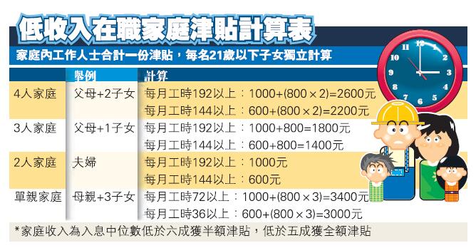 符合家庭入息及资产限额的2人或以上家庭,如果其中1名成员作为低收入津贴的申请人符合工时要求,便可以申领全额的基本津贴每月600元、全额的高额津贴每月1000元、半额的基本津贴每月300元或半额的高额津贴每月500元。以合资格4人家庭,父母与两名小孩为例,每月工时达192小时以上的可有2600元津贴,每月工时有144小时以上的亦有2200元津贴,家庭收入为入息中位数低於六成的可获半额津贴;低於五成获全额津贴。
