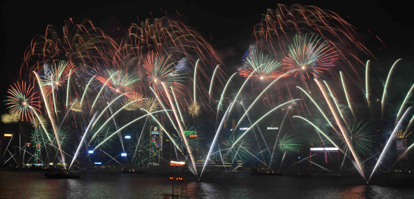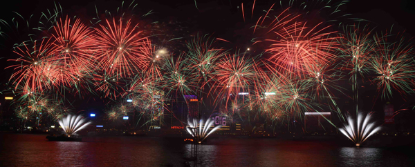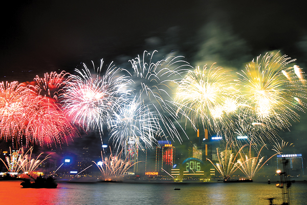 璀璨的煙火匯演於今日零時準時上演。今年的主題是「愛與歡樂」,歷時8分鐘,維港上空出現多個心形及超過160個笑面圖案,象徵2016年充滿希望與活力。圍觀者「嘩」聲四起,歡呼連連。