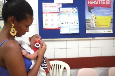 2月1日,在巴西伯南布哥州首府累西腓附近,一名妇女抱着患有小头症的孩子在医院等待检查。