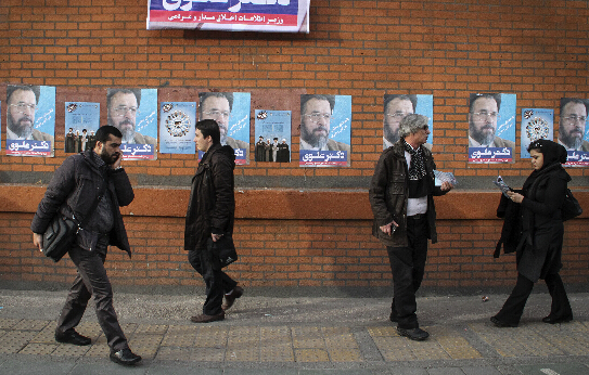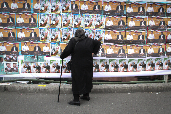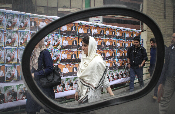 2月22日,在伊朗首都德黑兰市中心,一名妇女观看几名候选人的参选海报。