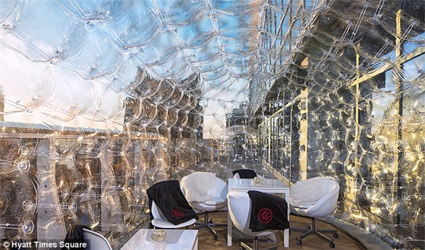 【环球网综合报道】据英国《每日邮报》2月23日报道,凯悦时代广场酒店的Bar 54是纽约最高的屋顶酒吧,最近该酒吧在54楼的阳台上安置了两个造型奇怪的泡泡球。客人坐在透明的泡泡球里,可以一览克莱斯勒大厦和纽约时代广场。