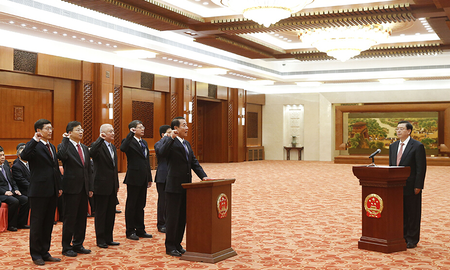 2月26日,十二屆全國人大常委會在北京人民大會堂首次舉行憲法宣誓儀式,張德江委員長主持并監誓。剛剛閉幕的十二屆全國人大常委會第十九次會議任命了全國人大有關專門委員會副主任委員、常委會工作委員會副主任等六名國家工作人員,依法進行憲法宣誓。
