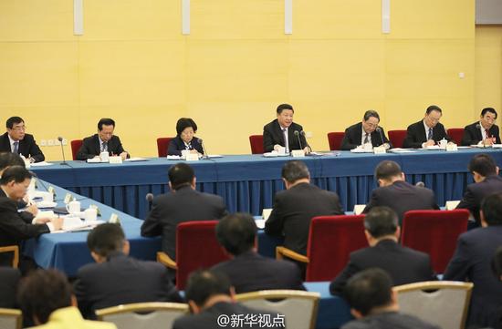圖為:2016年3月4日下午,中共中央總書記、國家主席、中央軍委主席習近平看望參加全國政協十二屆四次會議的民建、工商聯委員,并參加聯組會,聽取委員們意見和建議。中共中央政治局常委、全國政協主席俞正聲參加看望和討論。