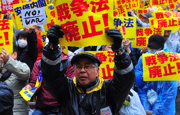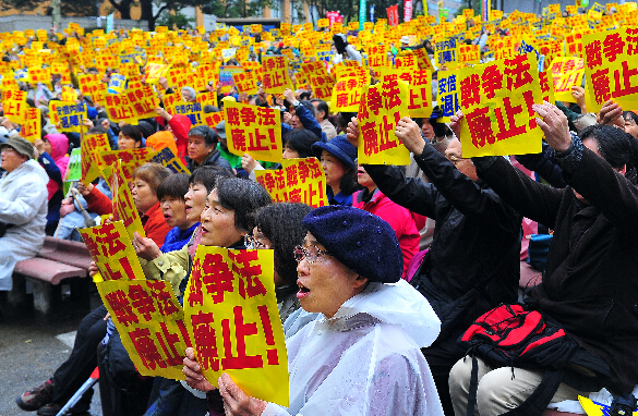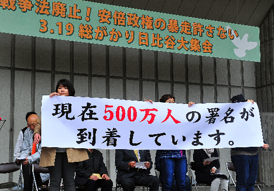 大批日本民众3月19日冒雨汇聚东京市中心的日比谷公园举行集会,强烈要求废除以解禁集体自卫权为核心内容的一系列新安保法。现场统计与会人数达5600人。