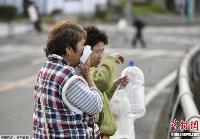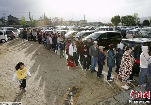 據中新社報道,在地震重災區熊本縣益城町,人們聚集在當地一所學校裏躲避地震,震後民眾排隊領取食物和飲用水。據媒體報道,為了不讓孩子和寵物打擾在避難所裏的其他災民,一些家庭主動在自家車內避難。目前災區規定一家一天只能發2升水,老人用藥大量缺乏,醫院承受能力達到極限。