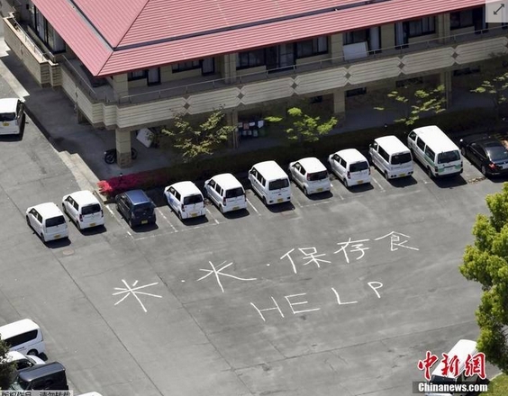 在熊本的一個敬老院的停車場空地上,寫著“水、大米,罐頭食品及幫助”的字樣。據熊本縣政府統計,全縣有約11萬人在723處避難所避難。