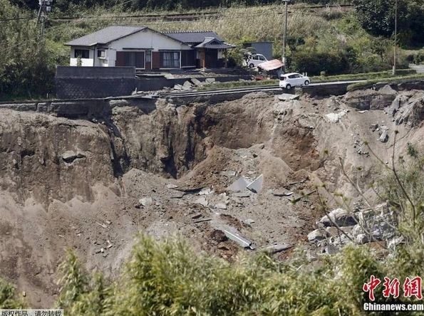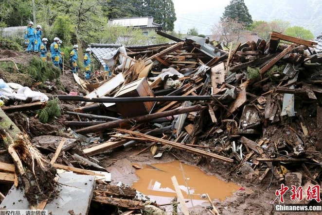 熊本地震引發阿蘇郡山體滑坡,多座房屋被毀。日本氣象廳說,此次連環強震伴隨大量餘震,盡管災區17日天氣轉晴,但災民應繼續防范山體滑坡等次生災害。