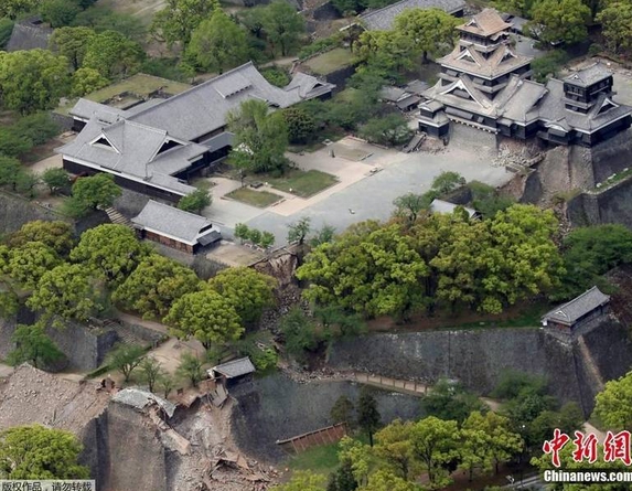 日本文化廳最新調查顯示,熊本縣有34處文物古跡不同程度受損,包括熊本城、阿蘇神社等國家重點曆史文化遺址。圖為有著日本三大名城之一稱號的熊本城部分外牆損毀嚴重。