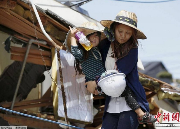 益城町的一名女性帶著自己的孩子從房屋廢墟前走過。據熊本縣政府統計,全縣有約11萬人在723處避難所避難。
