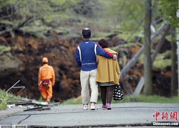 地震引發阿蘇郡發生山體滑坡,當地一名男子攙扶著自己的母親從廢墟前走過,他的父親在山體滑坡中失蹤。