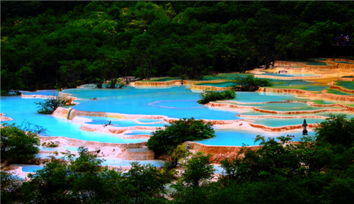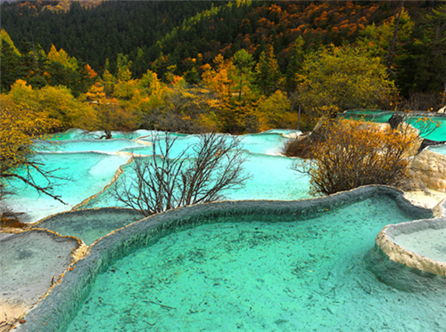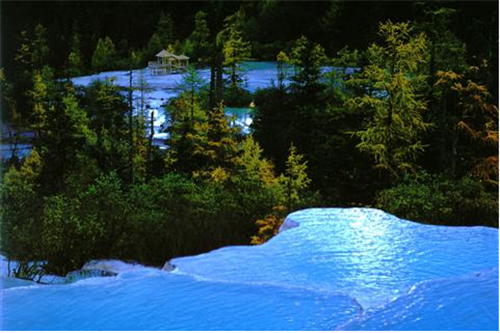 和彩林相互辉映的边石坝彩池群组——争艳池
