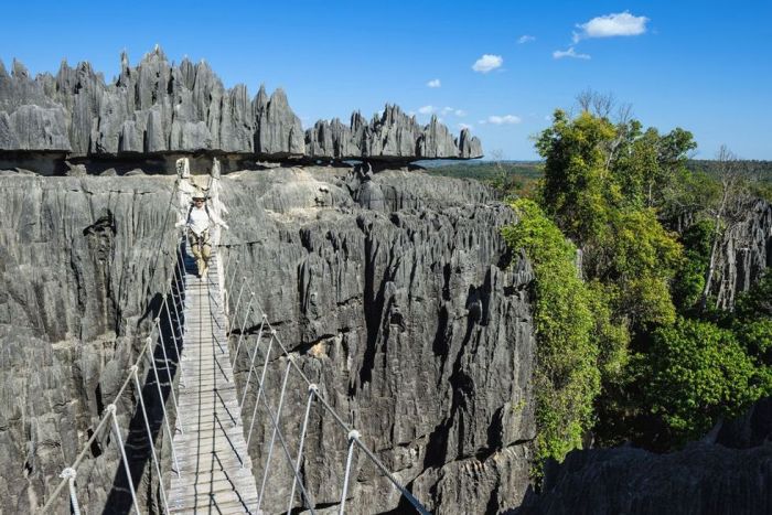 特别之处:马达加斯加迷宫般的石头,像穗状花一样有序排列,有别于世界其他景观。在过去,这里是一处禁地,专业人员只有通过垂直的悬崖、落水洞和地下隧道才能达到。(它被马达加斯加人命名为Tsingy,意思是"脚尖走路",就为这个原因)。但由欧盟资助的一个项目使得这里可以面对公众开放,这里有八条徒步路线,为不同水平的徒步者设计。