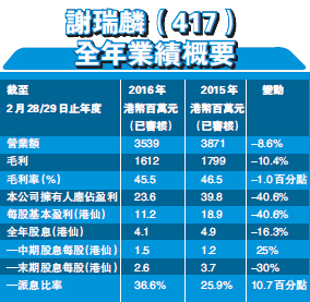 另外,謝瑞麟去年營業額下跌8.6%至35.39億元,主要受到內地訪港旅客人數減少令香港零售市場業績按年大幅下滑。期內港澳銷售營業額下降21.9%,同店銷售負增長24.3%。期內,盈利下跌40.6%減至2360萬元,連末期息2.6仙在內合共派息4.1港仙,按年下跌16.3%,但派息比率上升10.7百分點至36.6%。