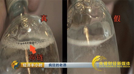 △真的五糧液在晃動后,酒花會像帶了一圈項鏈一樣,但假的五糧液就做不到這一點。