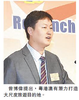 谈及香港旅游业可在「一带一路」背景下获得的新发展,曾博伟指,首先,香港可与内地共同建设世界级旅游目的地。他指出,粤港澳是中国经济最发达地区之一,具有丰富的旅游资源和旅游产品,有潜力打造成大尺度的旅游目的地;而随港珠澳大桥开通,香港、澳门及珠海的往来便利程度将大大提高,这三地也可建成小尺度目的地。
