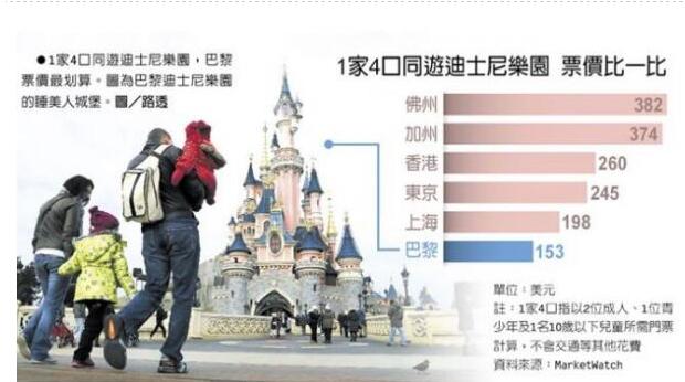 次貴的則是加州迪士尼,需374美元,后依序為香港、東京、上海、巴黎,在153至260美元間不等。