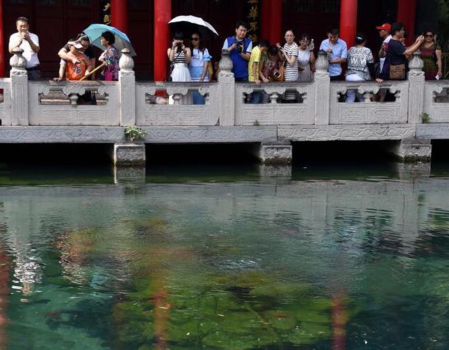6月28日,遊客在趵突泉參觀遊覽。從6月26日開始,濟南趵突泉泉水水位連續3天高於27.60米的紅色警戒線,解除了從3月24日開始的長達約3個月的停噴紅色預警。