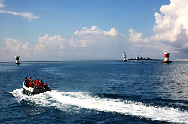 2016年5月,中國合肥艦士兵乘坐小艇巡航南沙島礁。(資料圖片)