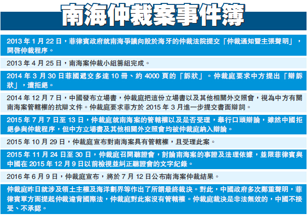 在仲裁結果出爐前夕,中國外交部發言人陸慷重申,中國從一開始就不承認、不接受南海仲裁案,所以「不會跟這個所謂非法的仲裁庭發生任何可能產生法律上意義的司法程序關系,我們也不會接受它提供的所謂任何不管是什麼樣的材料」。