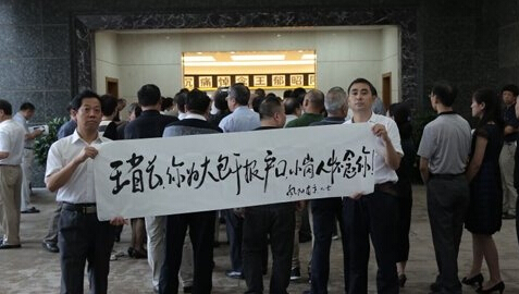 小崗村村民代表在告別廳外拉起紀念王郁昭同志的字幅。記者彭子洋攝