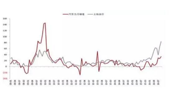 這里需要解釋的是第四點。通常認為房價上漲特別是暴漲對于包括汽車行業在內的產業消費可能存在擠出效應,但韓業軍認為,事實并非如此。他提出,土地溢價和汽車當月消費增速有較強相關性: