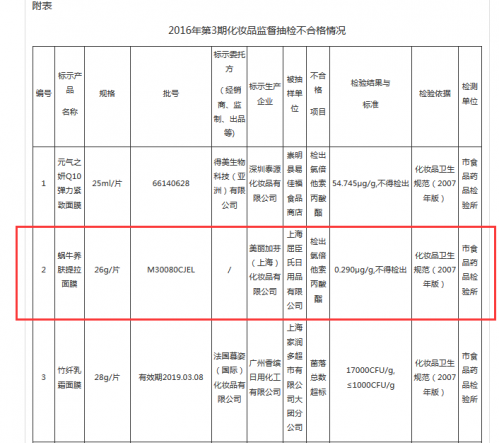 日前,上海食藥監局發佈2016年第三期化妝品監督抽檢品質公告,抽檢過程中5批次產品不合格,合格率為99.5%。在不合格產品中,美麗加芬(上海)化妝品有限公司生產的“蝸牛養膚提拉麵膜”被檢出含有氯倍他索丙酸酯,屬於糖皮質激素類物質,抽樣單位為上海屈臣氏日用品有限公司。