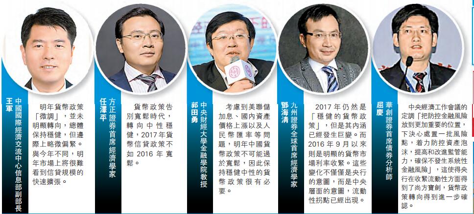 方正證券首席經濟學家任澤平認為,「貨幣政策告別寬鬆時代,轉向中性穩健」,2017年貨幣信貸政策不如2016年寬鬆。受房地產調控、通脹預期升溫、人民幣貶值和資本流出壓力、2017年美聯儲加息次數增加等因素影響,未來中國貨幣政策寬鬆的制約因素開始增多。據中新社報道,中央財經大學金融學院教授郭田勇表示,從金融角度看,貨幣政策要為經濟增長、供給側改革創造良好環境。考慮到美聯儲加息、國內資產價格上漲以及人民幣匯率等問題,明年中國貨幣政策不可能過於寬鬆,因此保持穩健中性的貨幣政策很有必要。