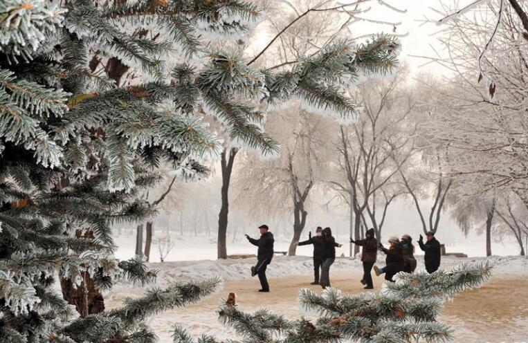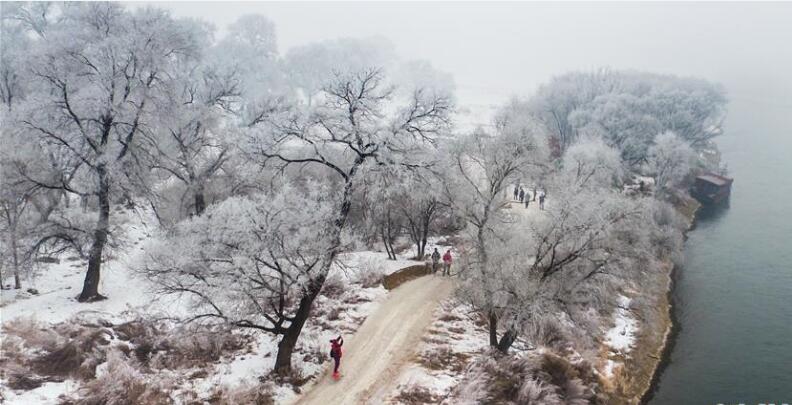 19日,黑龍江省牡丹江市、吉林省吉林市現霧凇美景,城市在霧凇的裝扮下呈現別樣風情,銀裝素裹、玉樹瓊枝,吸引眾多遊客前來觀賞。
