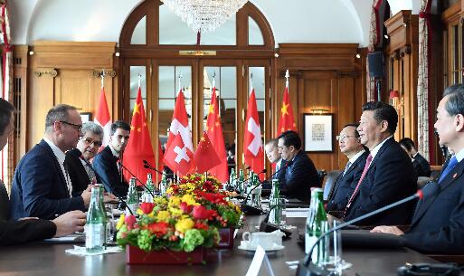 16日,中国国家主席习近平在伯尔尼会见瑞士联邦国民院议长施塔尔和联邦院议长比绍夫贝尔格。