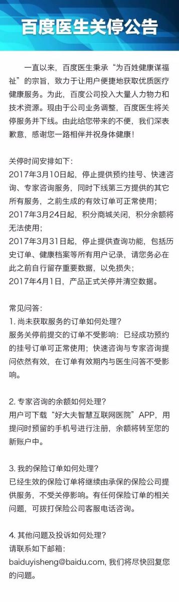 在公告中,百度醫生方面表示,百度醫生致力於讓用戶便捷獲取優質醫療健康服務,為此,百度公司投入大量人力物力和技術資源。現在,百度公司業務調整,百度醫生將關閉服務並下線。