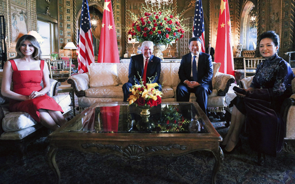 下午5時許,習近平和夫人彭麗媛抵達海湖莊園,特朗普和夫人梅拉尼婭在停車處熱情迎接。兩國元首夫婦合影留念,親切交談。兩國元首夫婦共同欣賞了特朗普外孫女和外孫演唱中文歌曲《茉莉花》並背誦《三字經》和唐詩。