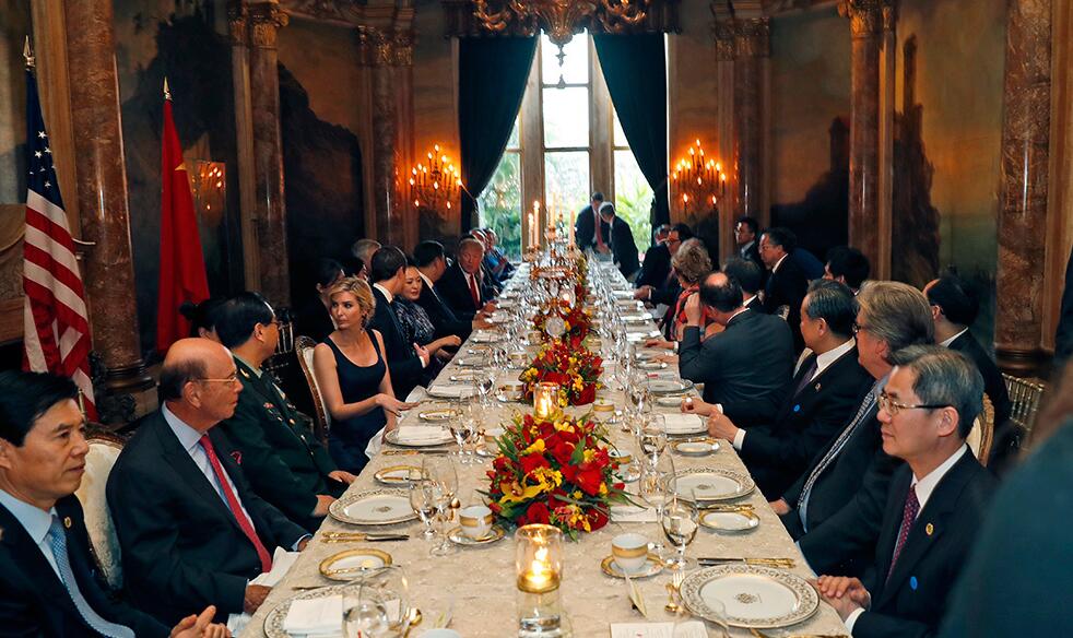 前年,特朗普曾批評奧巴馬為習近平主席安排國宴,並稱若自己出任總統將要習近平吃麥當勞。當地時間6日晚,特朗普在海湖莊園設宴招待習近平夫婦,則「打倒昨天的我」,菜單上有香煎多佛比目魚扒和紐約特選長牛扒。