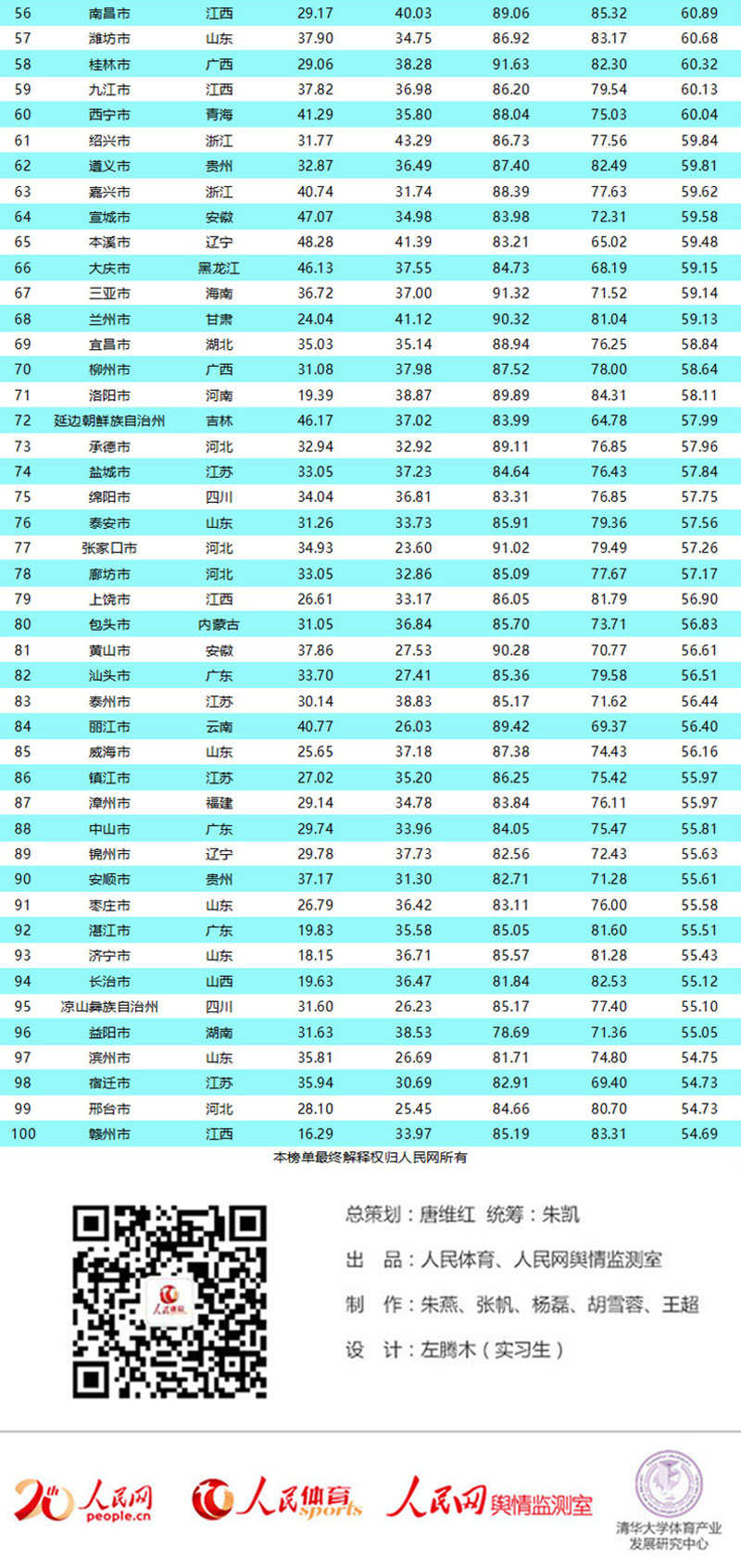 此榜單由人民體育與人民網輿情監測室聯合發布,由清華大學體育產業發展研究中心提供支持。榜單涵蓋全國334個地級行政單位及4個直轄市,從城市賽事,城市場館,全民健身,體育活力4個相關指標對城市體育活力進行量化排名。