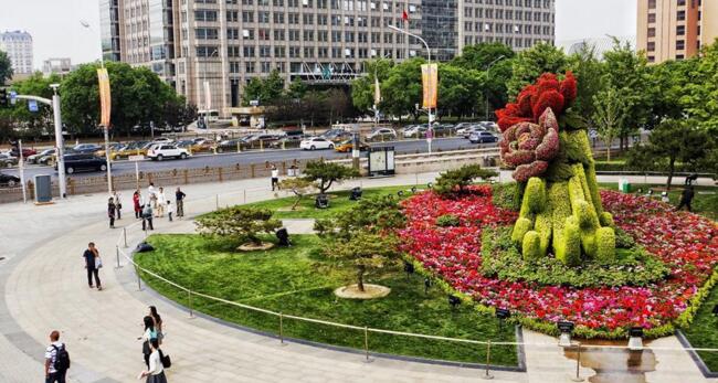 5月8日,市民走過布置在北京東單路口的“花開富貴”花壇。近日,北京在東單路口等地布置不同樣式的大型花壇,迎接即將在北京舉行的“一帶一路”國際合作高峰論壇。 新華社記者 李欣 攝