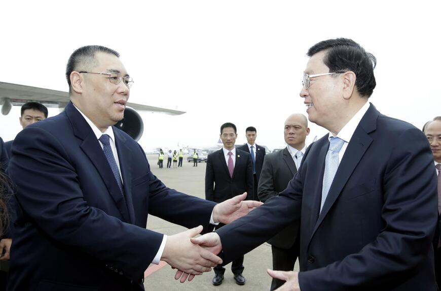 張德江(右)與前來送行的澳門特首崔世安握手話別。