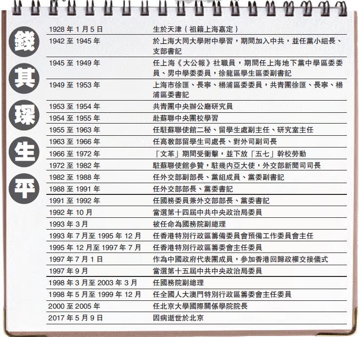【香港商報网訊】據新華社5月10日報道,中國共產黨的優秀黨員,久經考驗的忠誠的共產主義戰士,無產階級革命家,中國外交戰線的杰出領導人,中國共產黨第十四屆、十五屆中央政治局委員,原國務委員,國務院原副總理錢其琛,因病於5月9日22時06分在北京逝世,享年90歲。曾於1990年代出任香港特別行政區預委會、籌委會主任的錢其琛,在香港回歸過程中有著非常重要的角色。