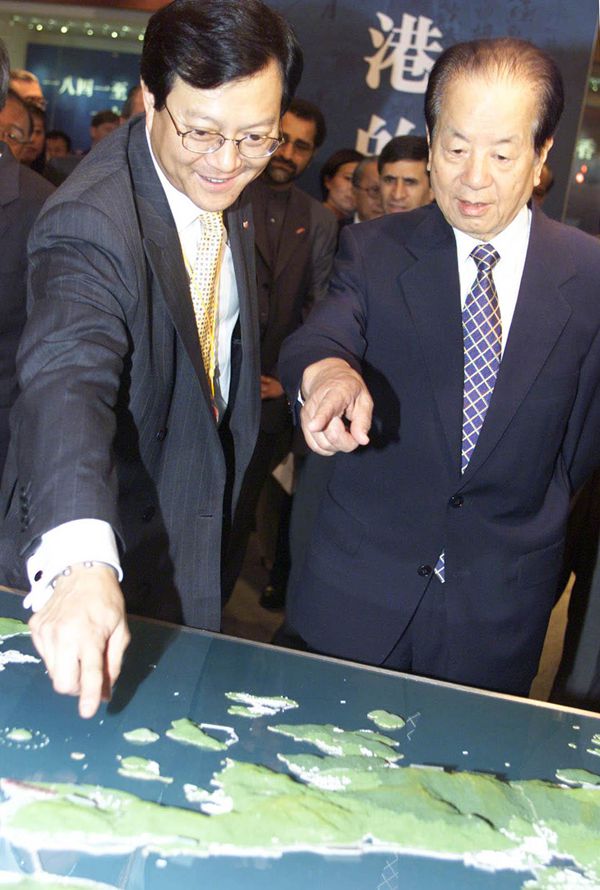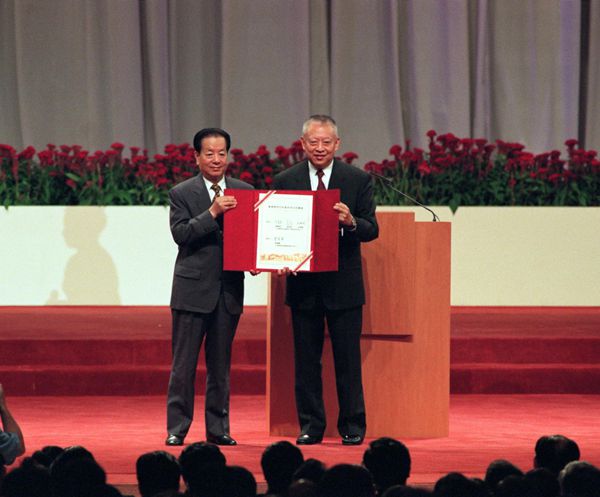 1997年7月1日,香港特别行政区政府成立庆典上,时任国务院副总理钱其琛将香港特别行政区土地基金证书交给首任特首董建华。资料图片