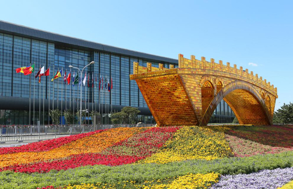 「一帶一路」國際合作高峰論壇今日召開。圖為位於北京國際會議中心前的「絲路金橋」景觀作品。 新華社